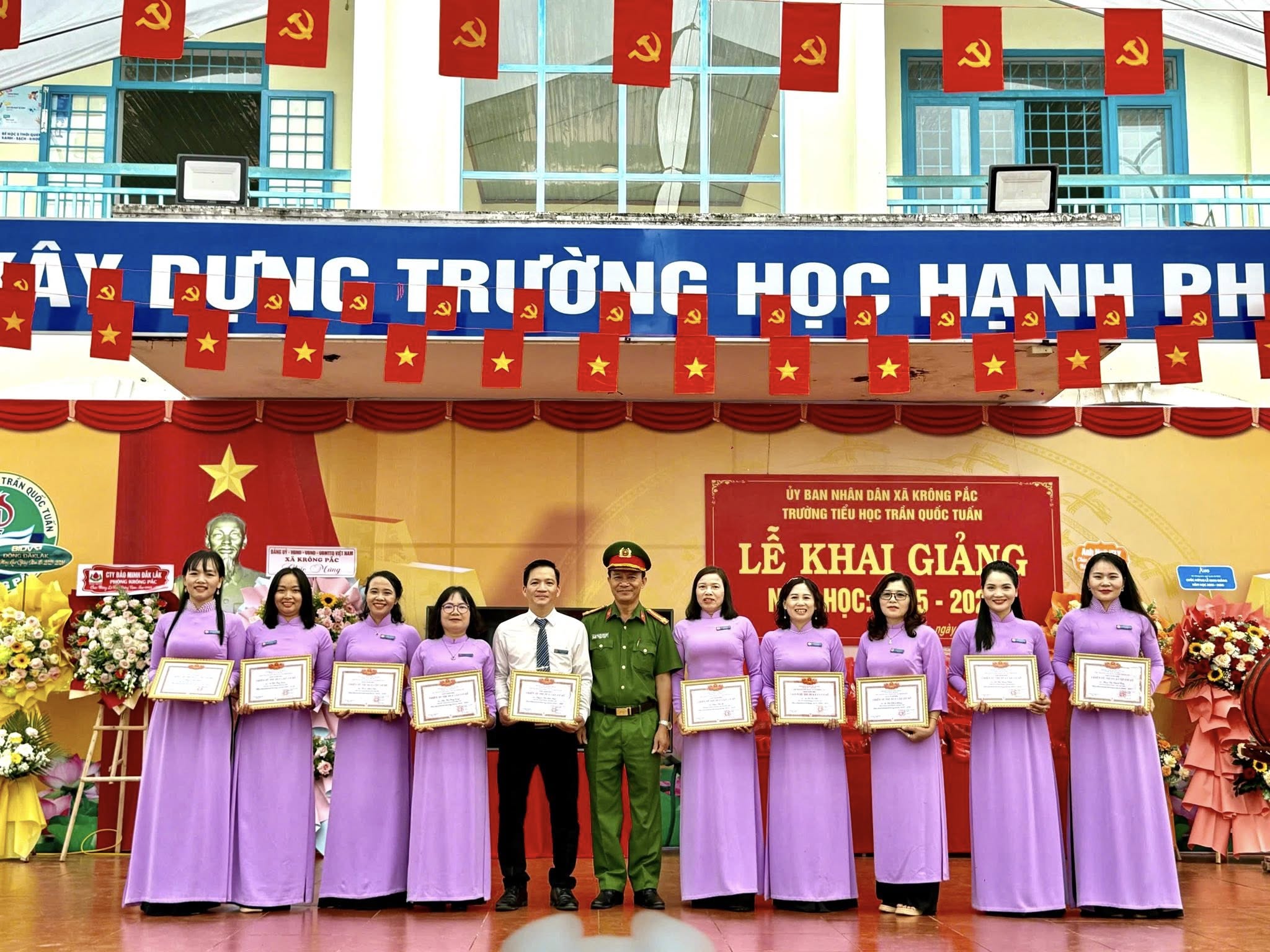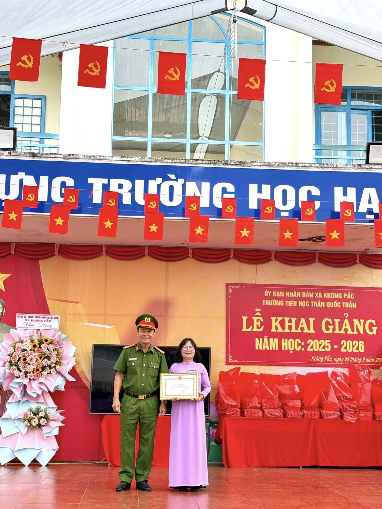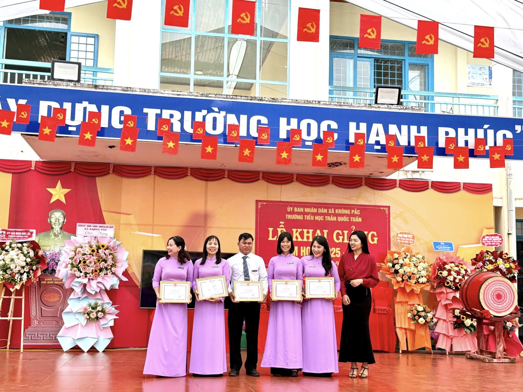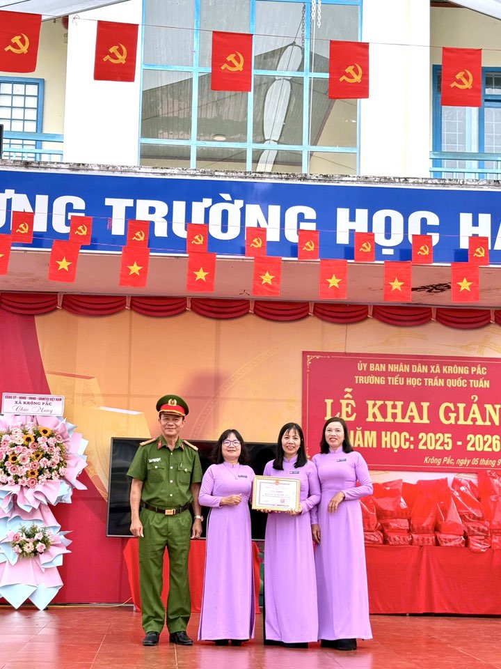 Nhân dịp khai giảng năm học mới 2025-2026, nhà trường rất vinh dự được đồng chí Nguyễn Hùng Hậu UVBTV, Trưởng Công an xã, đồng chí H Ma Đa La Niê ĐUV, Phó Chủ tịch UBMTTQVN xã kiêm Bí thư đoàn về dự và đại diện cho xã tặng Bằng khen, danh hiệu Tập thể Xuất sắc năm học 2024-2025, Bằng khen của UBND tỉnh cho cá nhân cô Hiệu trưởng Lê Thị Minh Hương, 10 thầy cô đạt danh hiệu Chiến sĩ thi đua cấp cơ sở, 5 thầy cô được tặng Giấy khen của UBND xã Krông Pắc.